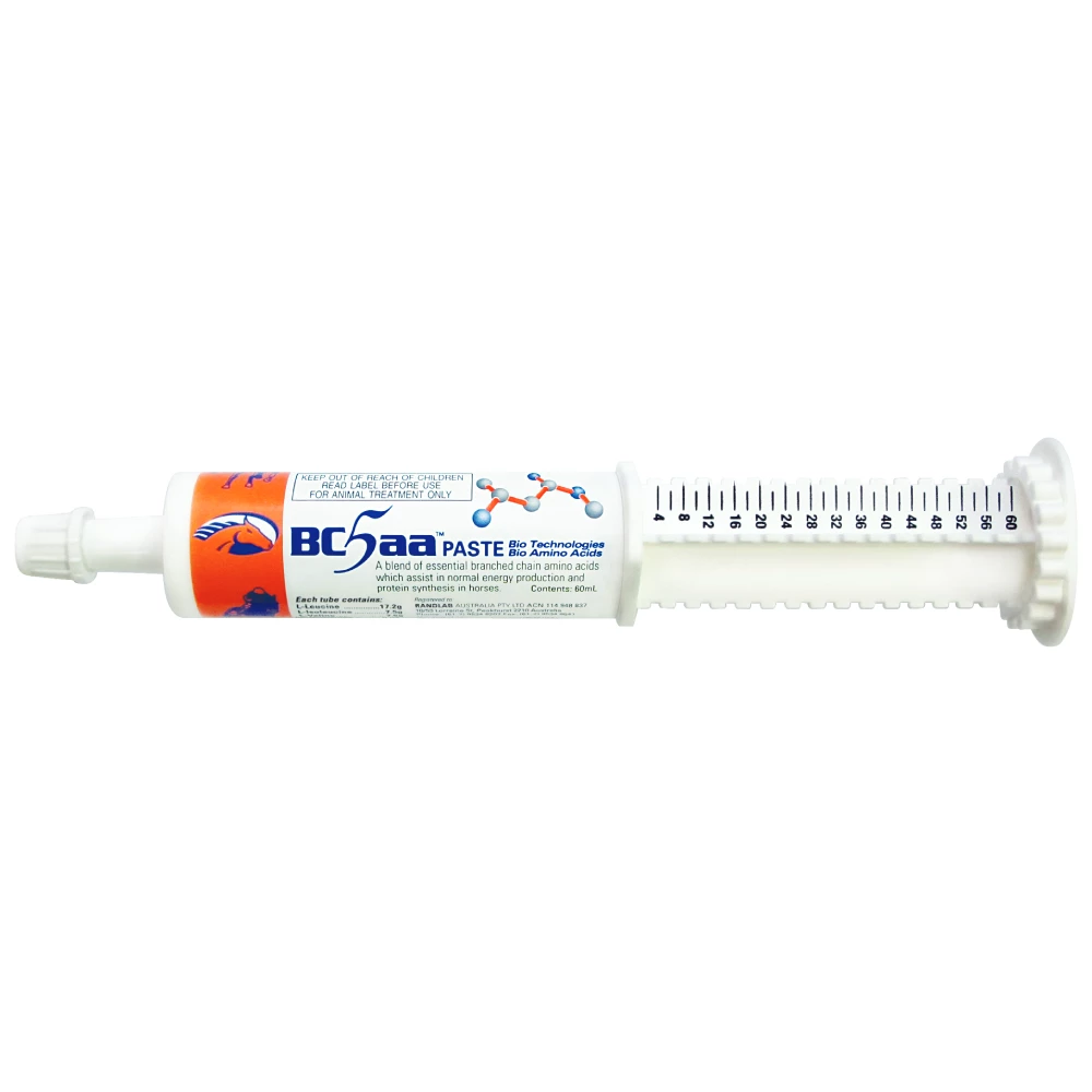 This product is a natural, safe, and effective oral paste for horses. In just 30-60mins prior to exercise, BC5aa allows for readily available circulating branched-chain amino acids. It can be given pre-workout, during trailering, training, and to horses prone to tying up.