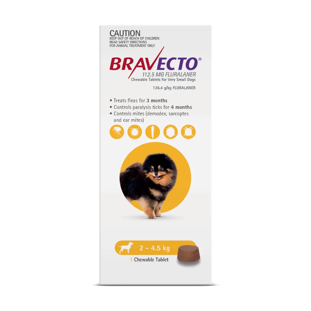 Bravecto Chewable tablets for dogs is a chewable tablet for the treatment and prevention of flea infestation and control of brown dog tick and paralysis ticks. Bravecto Chewable tablets protect against fleas for 3 months and against the deadly paralysis ticks for 4 months. Bravecto Chewable tablets also control Flea Allergy Dermatitis in dogs by controlling adult fleas. It can be used on puppies over 4.5lbs in weight and from 8 weeks of age and is safe to use on breeding, pregnant or lactating animals. It comes as an easy to administer, tasty, chewable tablet.