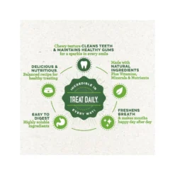 One GREENIESâ„¢ Dental Chew a day helps clean your dog’s teeth by using their natural chewing action to wipe away plaque and tartar buildup from the surface of the teeth. The chewy and flexible texture allows teeth to sink in with every bite all the way to the gums for more effective cleaning. Greenies bear The Veterinary Oral Health Council (VOHC) Seal of Acceptance for plaque and tartar control.
