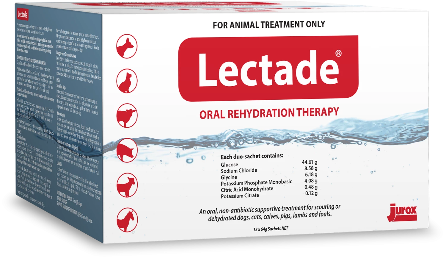 Lectade Oral Rehydration Therapy contains a balanced mixture of glucose, glycine and electrolytes to encourage a high degree of rehydration in scouring and dehydrated dogs, cats and young farm animals.