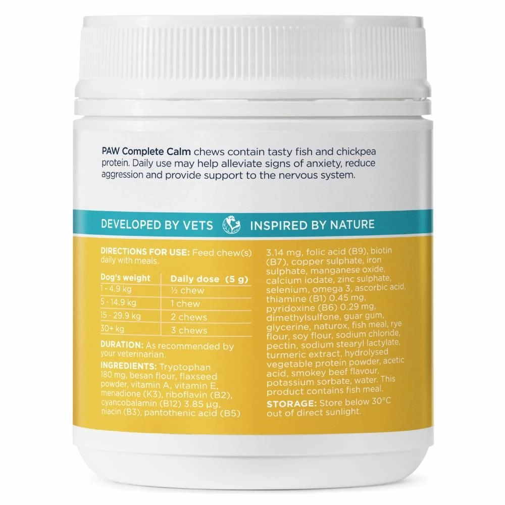 PAW Complete Calm Dog Chews 300g is a tasty fish and chickpea-based chews that contain key ingredients such as Tryptophan (180mg per chew), B group vitamins and a blend of multivitamins and nutrients to support the general health and nervous function in dogs.