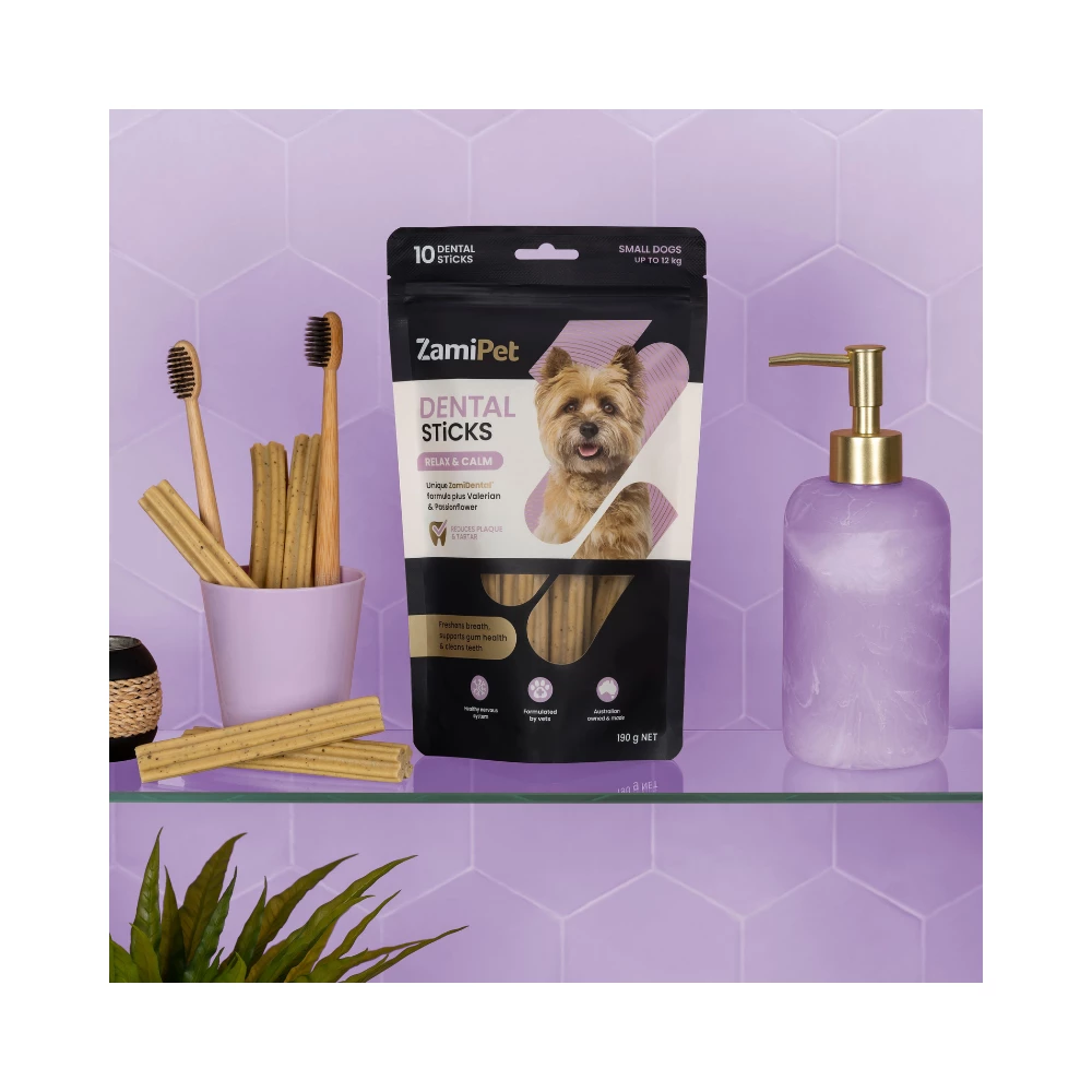 Purposely designed to bolster dental health and induce a sense of relaxation in small dogs, ZamiPet Dental Sticks Relax & Calm Dog embody the marvels of natural composition. These dental sticks, meticulously formulated, yield a host of advantages tailored to your cherished furry confidant.