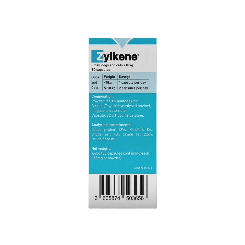 Zylkene for Small Dogs and Cats 0-10kg 75mg 30 Capsules contains a natural product derived from casein, a protein in milk. It is a molecule well known to promote the relaxation of newborns after breastfeeding and helps your pet cope when faced with stressful and unpredictable situations.